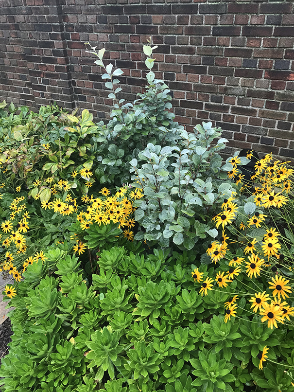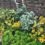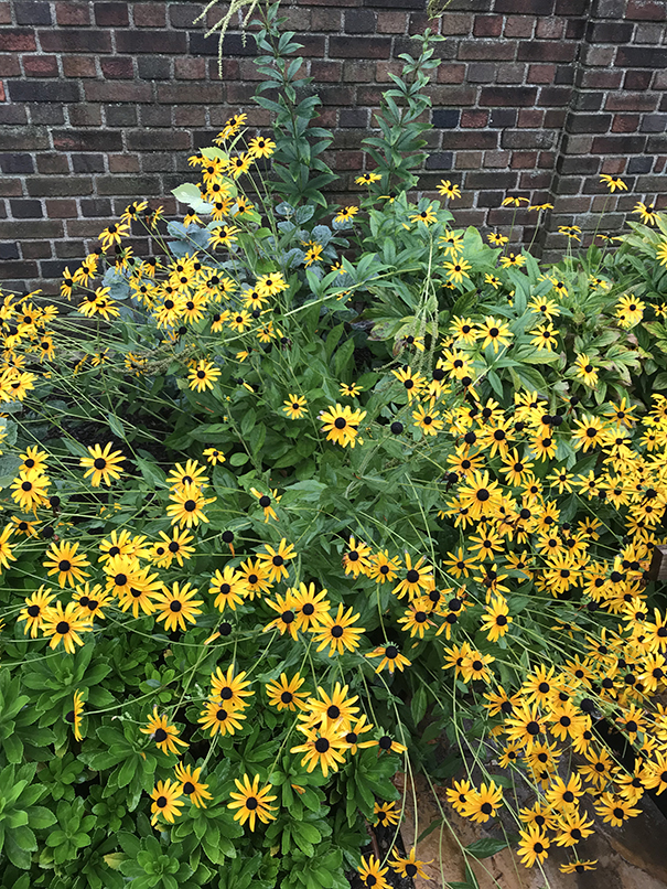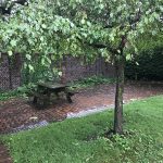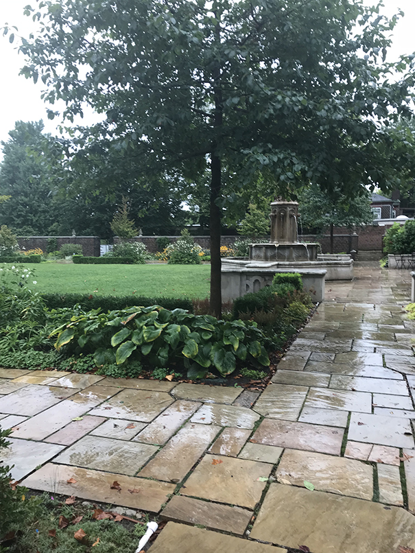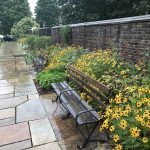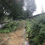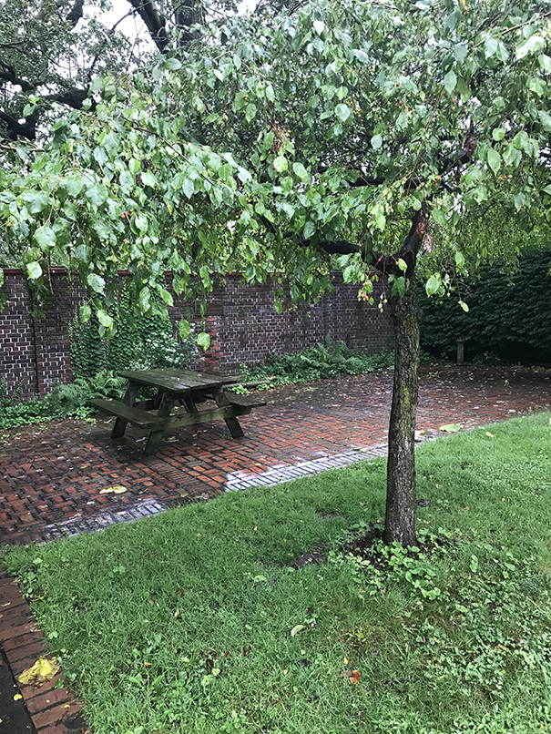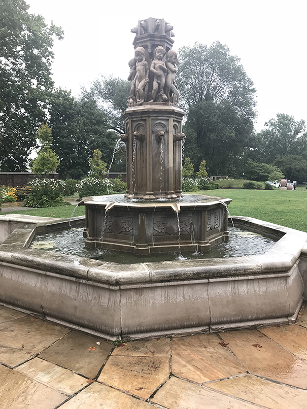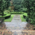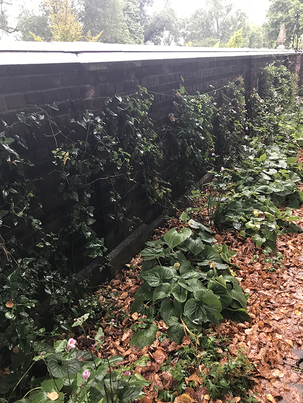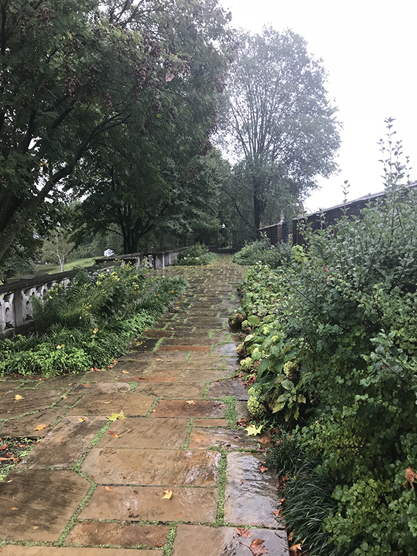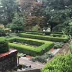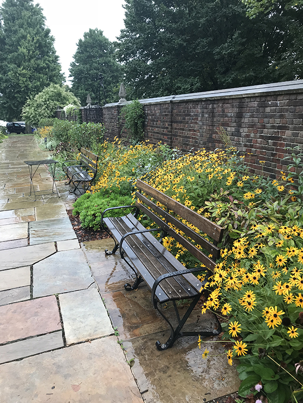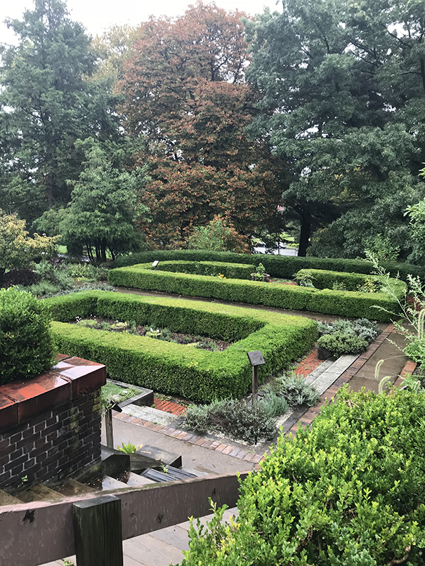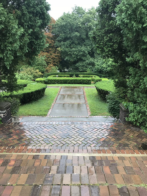 But my mental meanderings cease as I reach the first of the Walled Garden’s walls. I am at the northwestern corner of the garden. The wall is brick, high enough to hide what it holds from prying eyes, but it gives way near the corner to three stone steps, an entrance heralded by hard-angled cones atop columns that fortify the frame. As I stand outside it, I feel strange, liminal, timeless, as if I’m about to step into the past. This is not primal Nature, this is clearly not unmediated wilderness, but it is also clearly not the city, not the concrete jungle just a few dozen feet behind me. This is special.