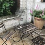 A small rustic table and chairs on a patio, and a Styrofoam cup beneath it all.