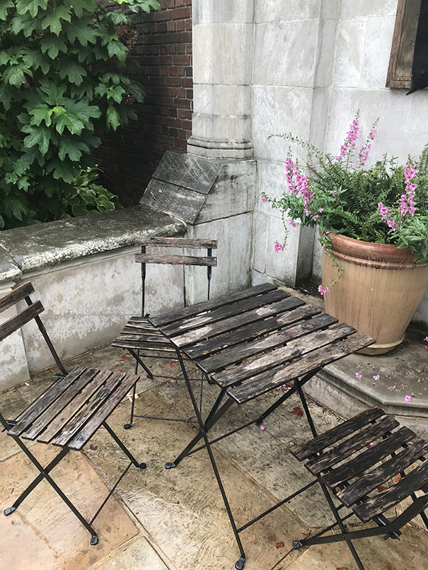 And yet, on the other hand, some part of my brain still points out flaws, points out problems, points out intrusions. Here’s a sign that tells people to keep their dogs on leashes. Here’s a piece of strange machinery that looks like a space heater. Here’s a quaint table and chairs… and, if you shift yourself ever so slightly to the left, a styrofoam coffee cup. It is impossible, even here, even if we want to, to truly relinquish our ties to the real world, to modernity, to the skyscrapers and office spaces and Starbucks. To interruption, to humanity, to people. To what and who we are.