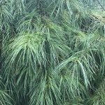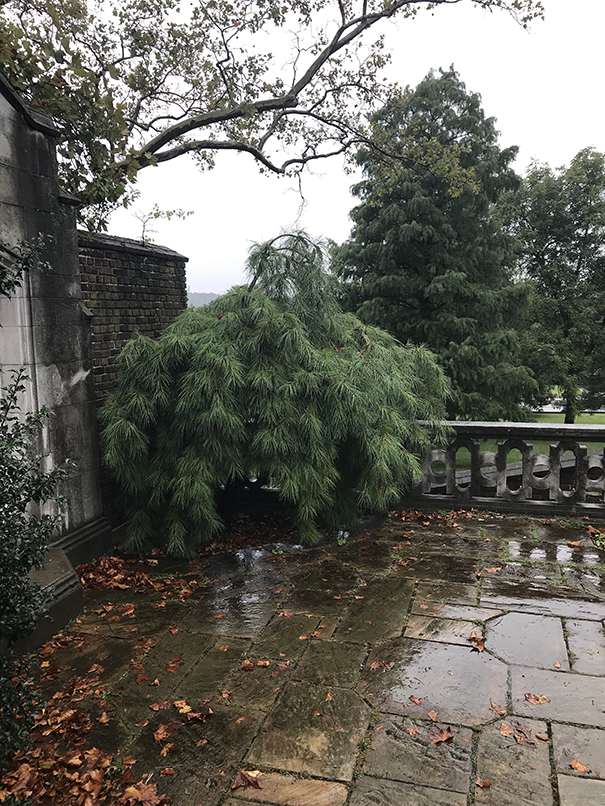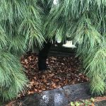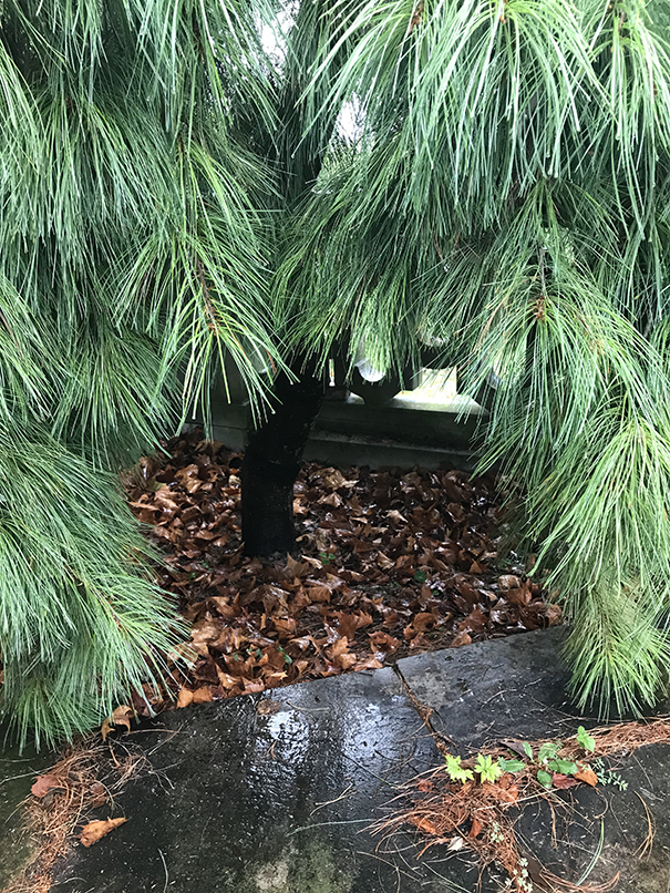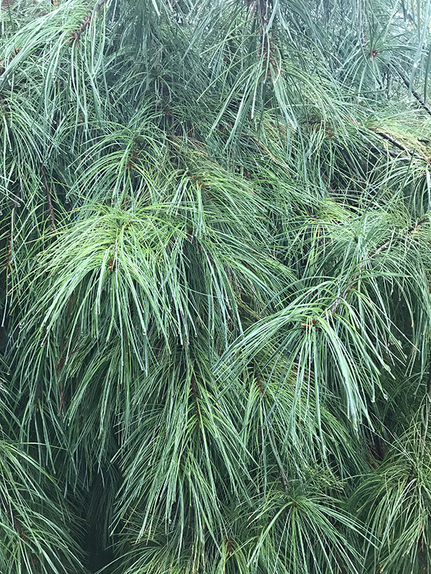 A weeping pine whose needles hang open around the bottom, appearing almost like an entryway.
