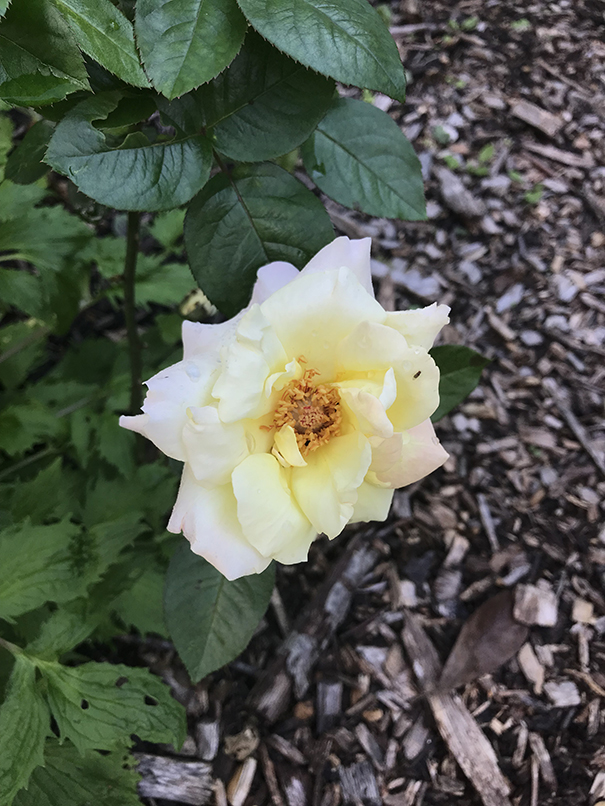 I see one flower. Its petals are faded yellow tattered edges; its center is dried up, verging on withered. I take a picture anyway, because it’s the one flower I’ve seen in this rose garden. I try to identify it, but the cards are placed badly, and I can’t tell if this flower belongs to that card, this card, or that card over there, so I give up. A few steps away, I try to take a picture of a fat bumblebee hovering over a patch of flower corpses, but it won’t stand still — probably because the flowers are all dead and the bee isn’t a necrophiliac — and I’m allergic anyway, so I don’t get too close. This trip, I decide, is a bust, and I walk back to my mom, passing the ant-filled cup, the dead and dying plants, the derelict placards. Within minutes, we’re back in our car, heading to Walnut Street, where we’ll eat dinner, talk about my neuroses, and drive home.